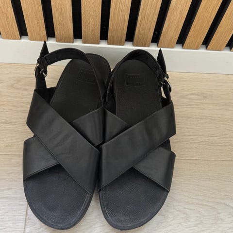 Nye ubrugte sorte sandaler, der kun har været prøvet på. Lækker Dr Martens kvalitet, model Voss i blank skind. Fejler intet og er fra røgfrit hjem. Kraftig rillet sål med de klassiske gule syninger rundt om kanten.