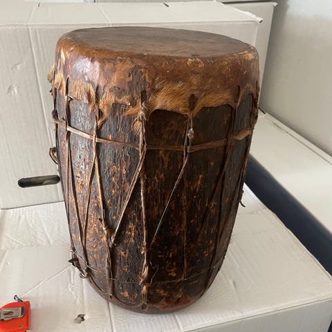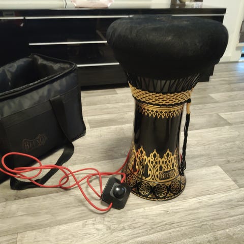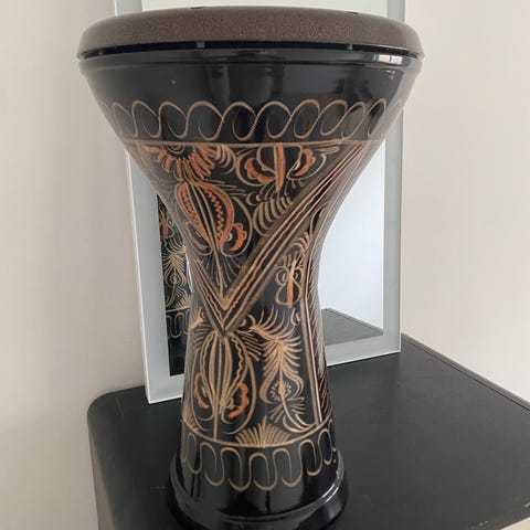 Rød darbuka-tromme med hvidt trommeskind og skruer rundt i kanten. Den er høj og slank i formen og kan bæres og opbevares i den viste taske.