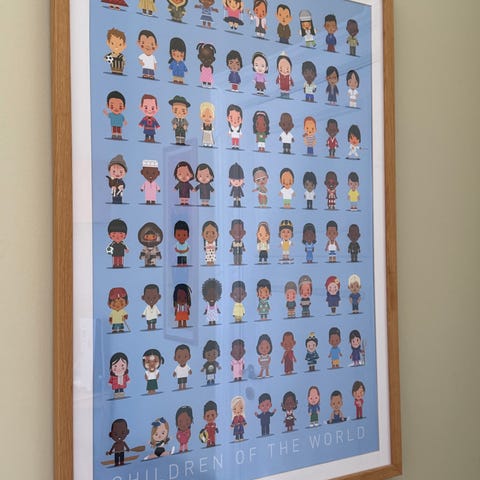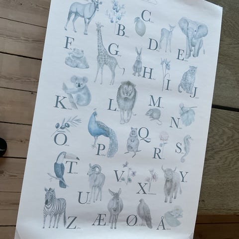 Fin plakat med forskellige pattedyr og tekst nederst. Sidder i en enkel træramme, klar til at hænge op på væggen