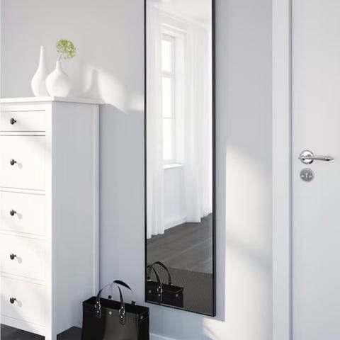 Stort IKEA spejl med sort ramme, der kan stå op ad væggen eller hænges op.