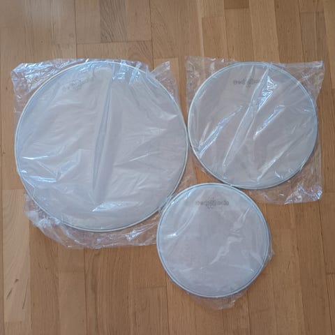 Stortrommeskindet svarer til Powerstroke 3 clear og tam-skindene svarer til Ambassador clear. Alle er nye og ubrugte.