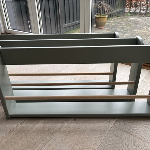 Lange hylder produceret ved smed og er siden hen brugt i et showroom. Er blevet behandlet med blånerings væske som giver en mørk bestandig overflade. Måler 181x20x15cm