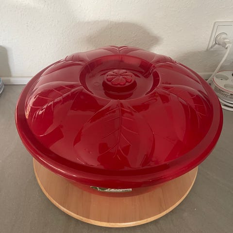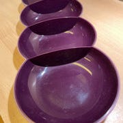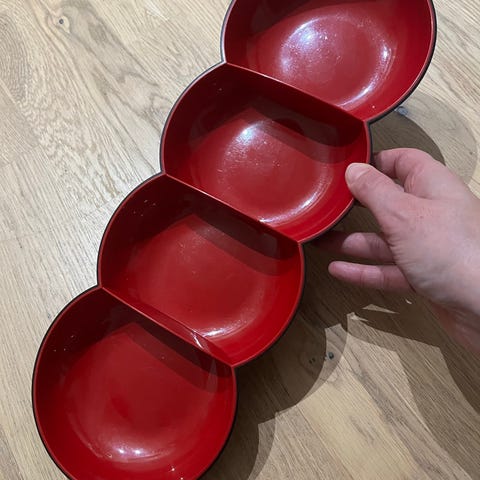 Rød preludio Tupperware serveringsskål i hård plast med oval form. God til fx salat eller frugt på bordet.