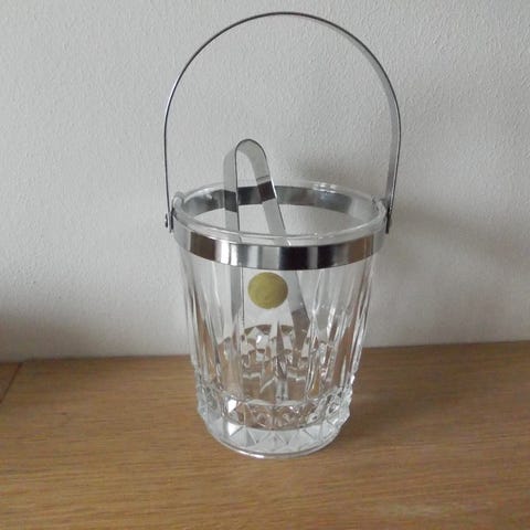 Vintage isspand i kraftigt glas med mønster og metalhank. Der følger en simpel metal-istang med riller i enden.