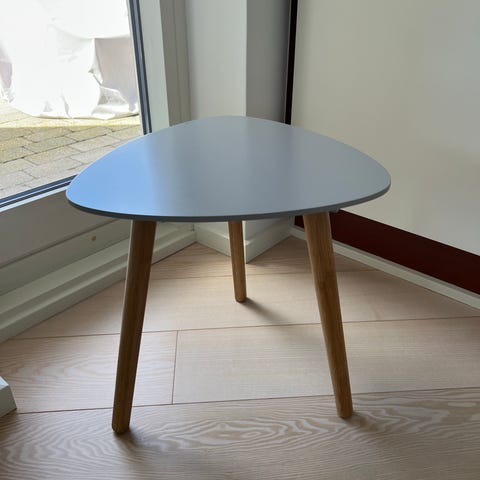 Trekantet natbord fra Søstrene Grene. Bordet har tre ben og er i farven grå. Bordet har mindre brugspor, der kan ses på billederne.