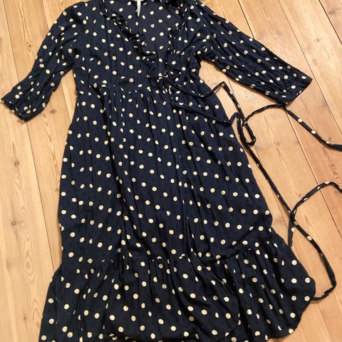 Sort smuk festkjole fra Neha i str L/XL med guldprikker og V-udskæring. Lang model med pyntesnore med guldperler for enden og aftagelig underkjole.