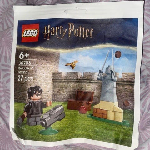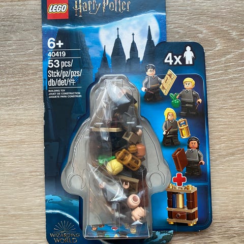 Lille LEGO Harry Potter sæt med figur, vogn og lidt ekstra tilbehør. Instruktionshæfte følger med, så det er nemt at samle igen.