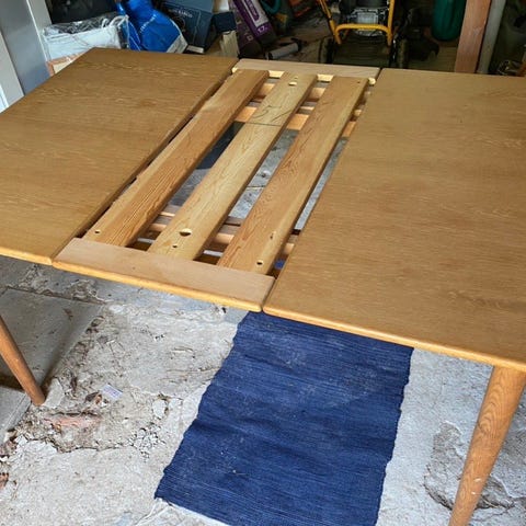 Multifunktionsbord i massivt egetræ og egefinér med foldbar og drejelig plade. Det, der gør dette bord særligt, er den originale rekvisitionsseddel fra Statsfængslet ved Nørre Snede, dateret 16. august 1982, som stadig sidder under bordet. En sjælden og dokumenteret historie, man normalt ikke ser bevaret. Konstruktionen er enkel uden indvendig opbevaring. Renset og let voksbehandlet. Flot stand med almindelige brugsspor.