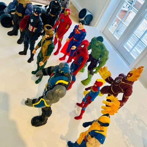 Stor kasse med mange figurer. Superhelte, dinosaurer, mange små funko pop mm.