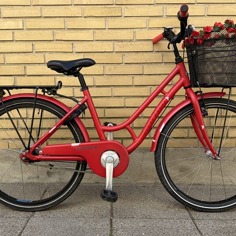 Modellen er skoleklar med forsikringsgodkendt lås med 2 nøgler, fastmonteret kurv med blomsterkrans, bagagebære, lys for og bag, ringeklokker og reflekser.