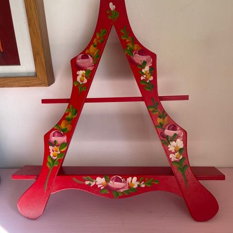 Fin grøn træhylde med håndmalede blomster og tre hylder i en trekantet form. Kan hænges op på væggen og har god plads til småting eller pynt.