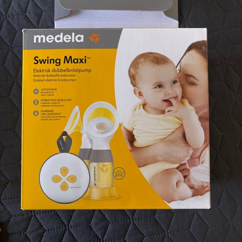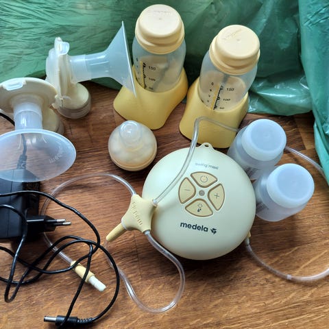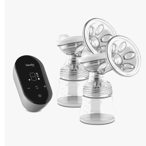 Elvie Stride elektrisk dobbelt brystpumpe med slanger, to tragte og lille kontrolenhed. Har flere knapper til indstillinger og ligger i original æske.