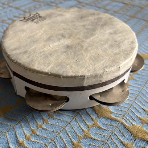 Tamburin med lyst trækant og skind på den ene side. Har flere metalbjælder rundt i kanten og justerbare beslag.
