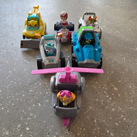 Paw Patrol figurer med hver deres køretøj sælges samlet. Figurerne kan tages ud af bilerne, og hjulene kan rulle.