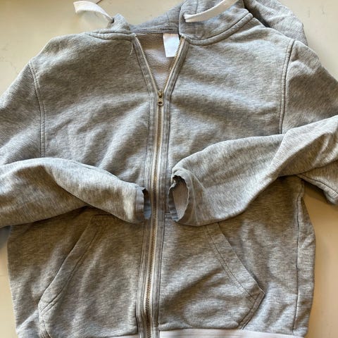 Ny bluse, blå og grå med blomster og hvid skrift. Str S, passer ca 164-170.