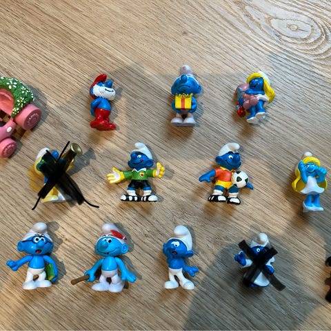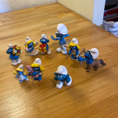 Samling af 42 Schleich Smølfer figurer med mange forskellige motiver og tilbehør.