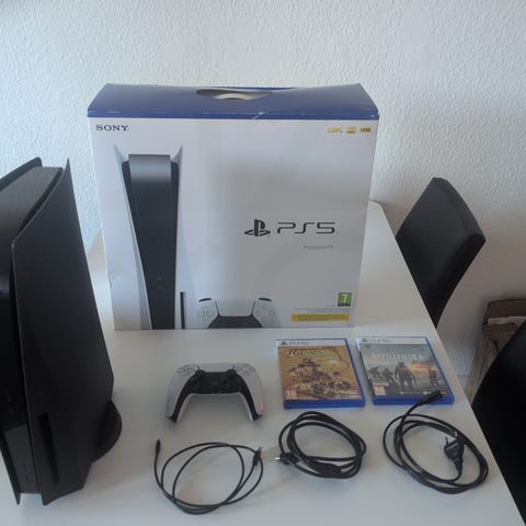 Med hvid/sort PS5 og DualSense controller, klar til at blive sat til tv’et.