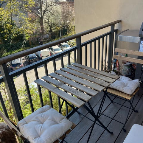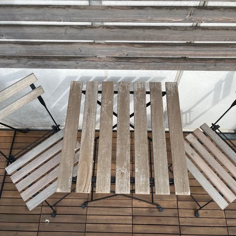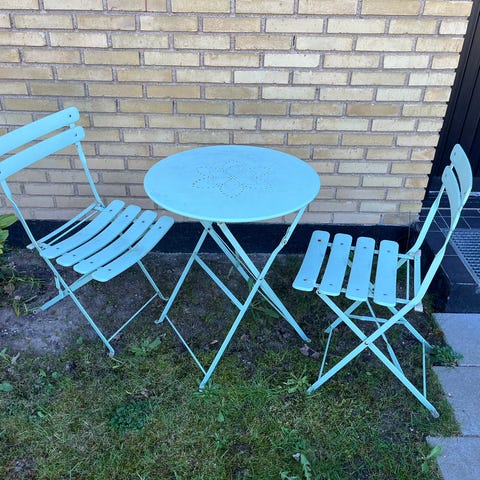 Fint lille cafésæt med bord og to stole i træ med sort metalstel. Bord og stole kan klappes sammen og passer godt til altan eller lille terrasse.