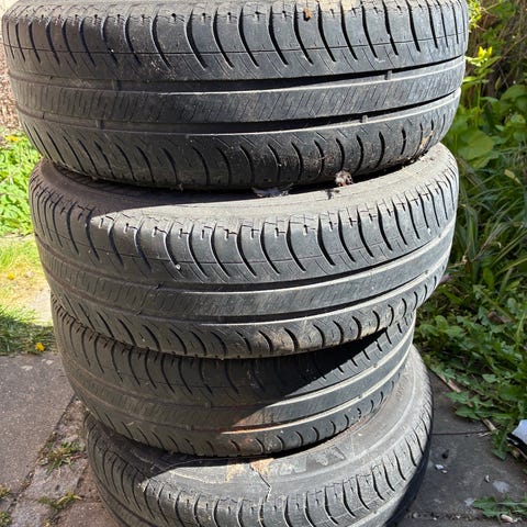 Dækkene har ca. 4 mm mønster tilbage og kører fint endnu – perfekte som billige sommerhjul eller som ekstra sæt.