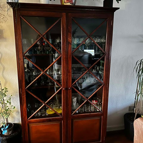 Vitrineskab med 2 glaslåger øverst.
