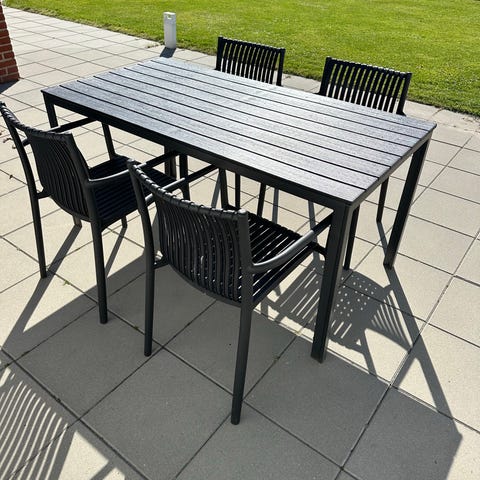 Havesæt med to loungestole, to fodskamler og et lille firkantet bord i grå aluramme. Stolene har armlæn og net-sæde/ryg, og bordet har glasplade på toppen. Det ene armlæn har en lille ubetydelig skade (se billede). Lækre letvægtsstole med god siddekomfort. Der medfølger 2 hynder, som dog ikke er købt sammen med stolene.