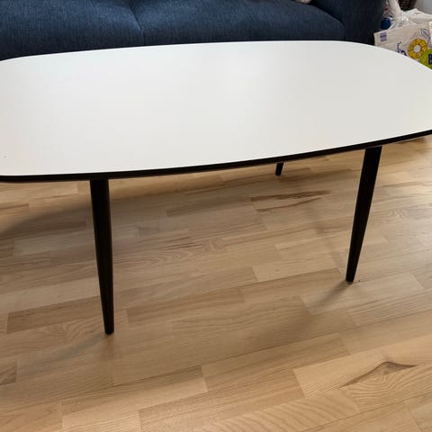 Dråbeformet sofabord i hvid laminat med sorte træben sælges