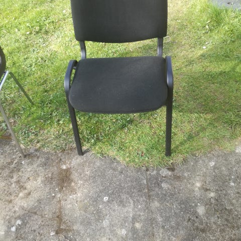 3 RBM Bella stabelstol med armlæne. Den har en let buet høj ryg, der giver stabil ergonomisk støtte. Skal i eg og inderside beklædt med cobelblåt stof med stålben i krom.