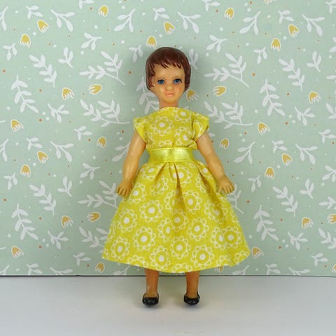Jeg har håndsyet en ny kjole til hende af blødt bomuld med blomsterprint med et bælte i satinbånd. Hun har også fået et nyt par underbukser i bomuldsjersey. Tøjet er ikke aftageligt, det er syet og limet på.