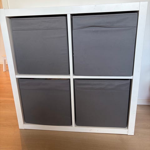 Sælger denne Ikea Kallax i hvid med 4 rum. Skab, 2 skuffer, og 2 kasser.