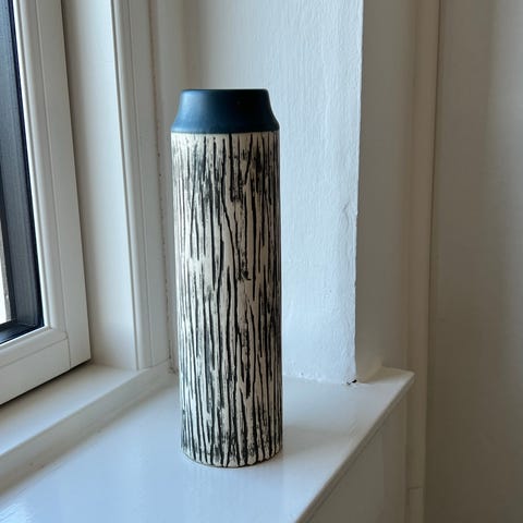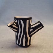 Dekorativ vase fra Hay i keramik formet som en træstamme med sidegrene. Mat mørk yderside med lyse striber og ensfarvet inderside, fin som blikfang på bord eller hylde.