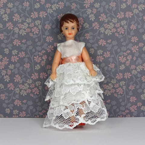 Vintage ARI dukkehus dukke. Lavet af gummi i Tyskland i 1970erne. Malede sko, ansigt og hår. Bevægelige arme og ben. I rigtig fin stand med minimal slitage på malingen. Hun læner en smule til højre, da en tidligere ejer har haft hende opbevaret lidt klemt.