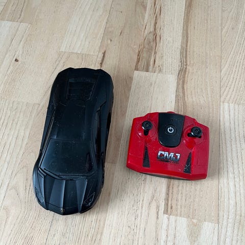 Rød fjernstyret legebil med sorte detaljer og fine fælge. Styres med den medfølgende håndkontrol med rat og teleskopantenne. Bruger batterier, men har lidt motor problemer, som en med forstand på teknik, nok kan fikse😊