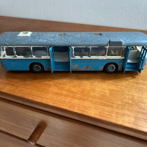 Rød Scania CR 76 modelbus i metal med detaljeret underside og små hjul. Dørene kan åbnes, og der er små ruder hele vejen langs siden. Været brugt som legetøj og derfor med tydelige brugsspor/ridser. Mgl dør til motor bagpå.