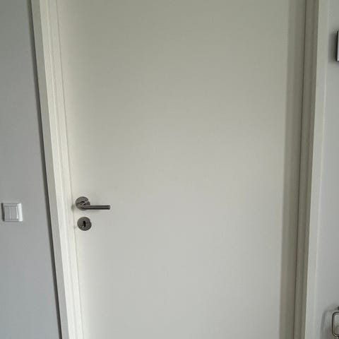 7 hvide indvendige døre med metalgreb. Den ene har nogle ridser. De er ikke massive og størrelsen er 825x2040x40 mm.
