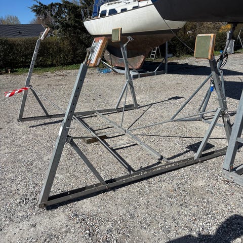 Stort galvaniseret bådstativ, Øsby smedene, til sejlbåd 36 fods med justerbare støtter. Mål 360X260. Står stabilt på jorden og er samlet med skråstivere og bolte. Hentes i Sønderborg.