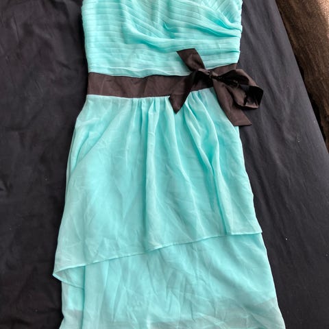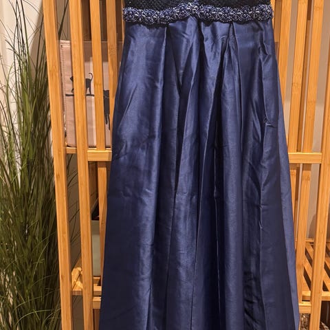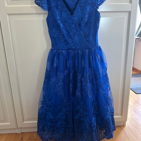 Kongeblå med lynlås i ryggen. Har kun været brugt én gang, men har ligget i en kælder. Passer til en størrelse S/M