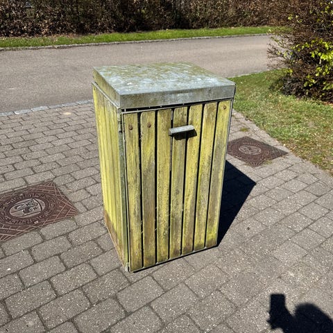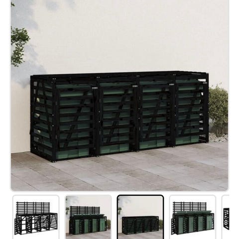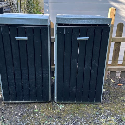Træ skraldeskjuler i lærketræ med lameller, der passer til to standard affaldscontainere. Åben top og let adgang fra forsiden, bygget i kraftige stolper og brædder.