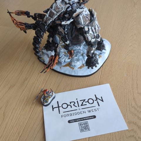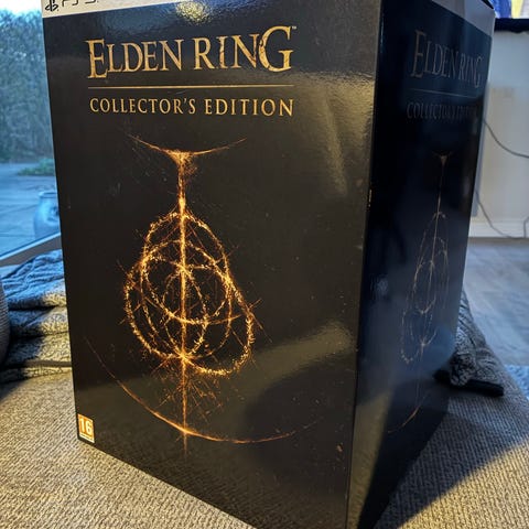 Elden Ring Shadow of the Erdtree Collector’s Edition med stor figur med rød kappe og mange detaljer. God til samleren der vil have en stor statue fra spillet stående fremme. Er lidt støvet men det er det æske med føgler