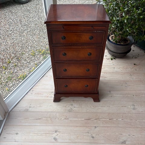 Kommode i fyrretræ med 6 skuffer og metalgreb. God til opbevaring, fylder ikke så meget og er nem at placere i rummet.