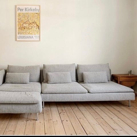 IKEA Jättebo modulsofa med højre chaiselong i samsala/gråbeige. Hver modul har opbevaringsplads og alle betræk kan aftages og vaskes. To flytbare nakkestøtter/pøller medfølger. Købt i 2023, brugt og elsket og passet godt på uden husdyr.