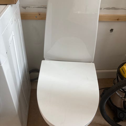 Ifö toilet i hvid med skjult cisterne og topbetjent skyl. S-Afløbet går i gulvet, og sædet følger toilettets runde form. Soft close og let aftageligt for rengøring. Skal limes fast.
