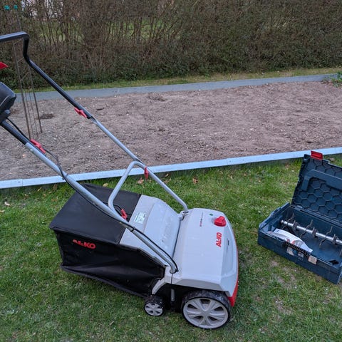 AL-KO vertikalskærer til plænen med opsamlerbag og højdejustering. Har håndtag med rød sikkerhedsknap og store hjul, så den er nem at køre med på fliser og græs.