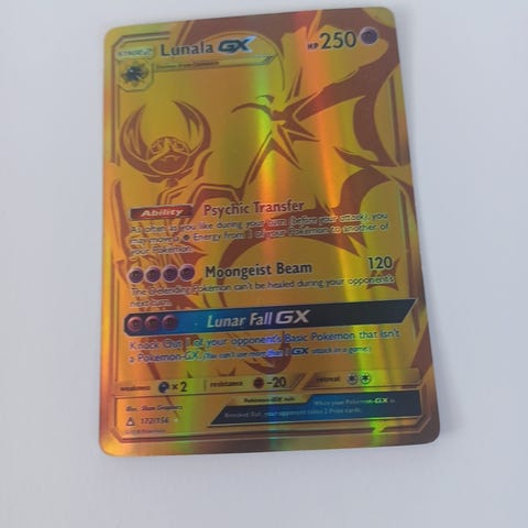 Solgaleo GX Pokémon kort i gul secret rare version med fuld art forside. Flot samlekort til Pokemon-samling med stærke angreb og tydelig tekst.