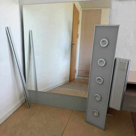 Spejlet er fra 2007, men fremstår pænt og velholdt med meget få brugsspor. Alt lys fungerer som det skal. Med 220 V stik i armaturet (med jord).