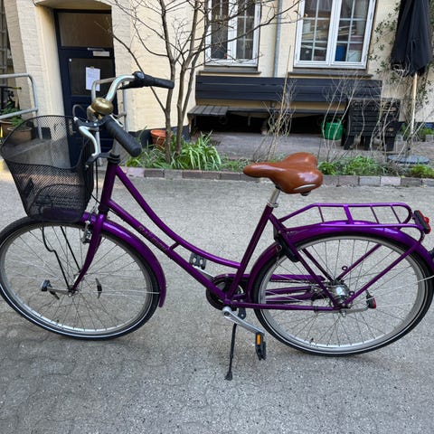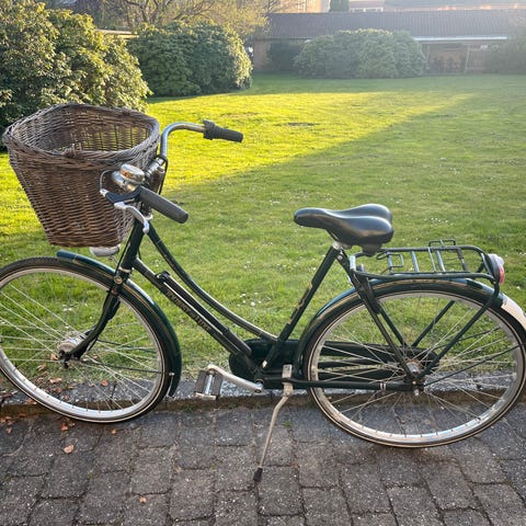 Raleigh damecykel i str M med 28" hjul og klassisk kædeskærm. Har fastmonteret bagagebærer, nyere fletkurv. Ny godkendt lås med låsebevis. Nye dæk og slanger. Ny sadel. Nyt 3 gears baghjul.