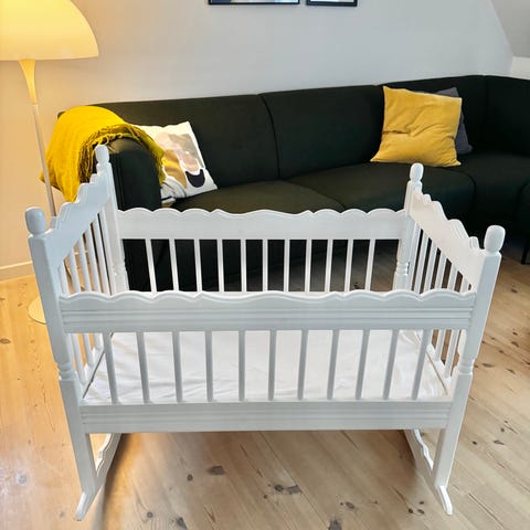 Vugge / seng til baby med tremmer hele vejen rundt. Stabil træramme og madras med mønsteret betræk med Svanemærke.