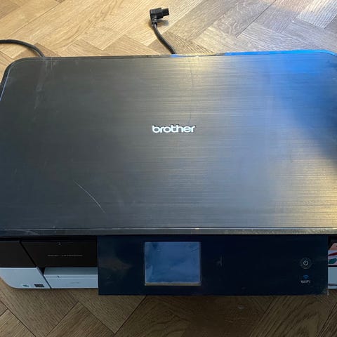 Brother DCP 7010 laserprinter med display og knapper på fronten. Har papirbakke foran og udtag øverst, nem at komme til på skrivebordet. Virker “fint” bortset fra st det ofte tager papiret skævt. Så hvis man kan fikse det, er den ok.