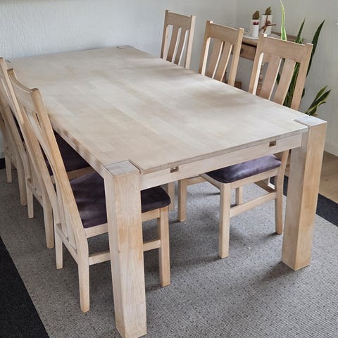Stort spisebord i ludbehandlet egetræ med seks tillægsplader.