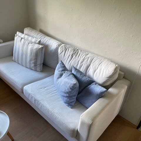 4 år gammel og fremstår derfor brugt. Stoffet er lidt slidt og lidt misfarvet nogle stedet. Stoffet kan tages af puderne og vaskes.