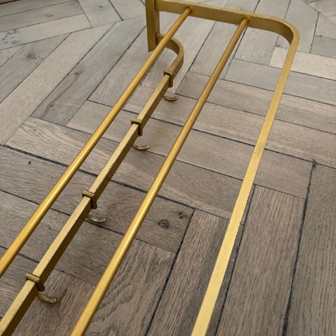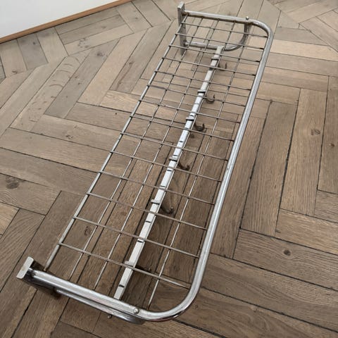 Klassisk krom hattehylde med gyldent stofnet fra 1960'erne (87cm lang)